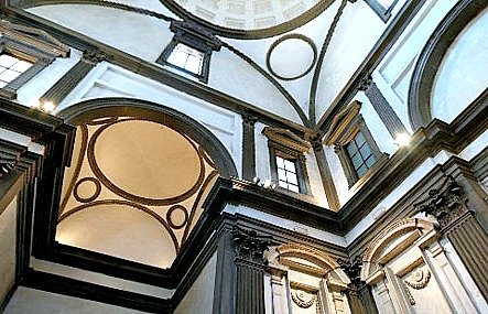 The architecture was inspired by the design of the Pantheon in Rome (126 AD). The domed ceiling of the New Sacristy is a replica on a much smaller scale of the Pantheon dome whose beauty, elegance and harmony was greatly admired by Michelangelo.